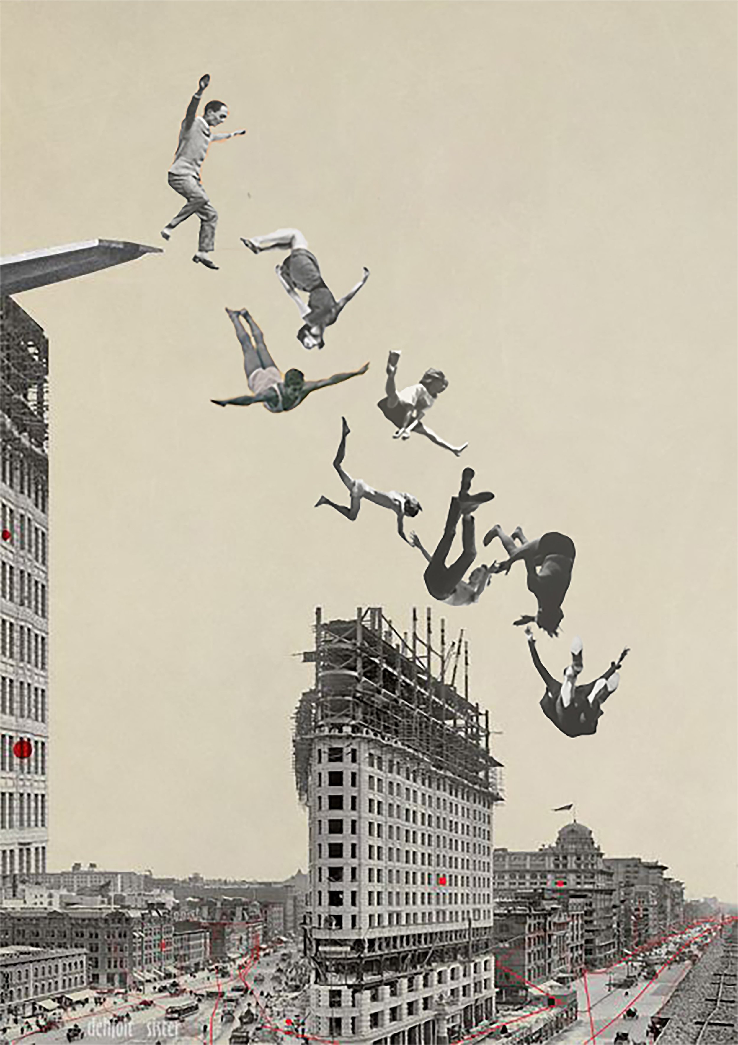 The collages are created using hands-on mixed media techniques: painting, pencil, watercolor, ink, and digital drawings. These elements are (re)printed and combined. Experimentation was the primary focus, purely for pleasure